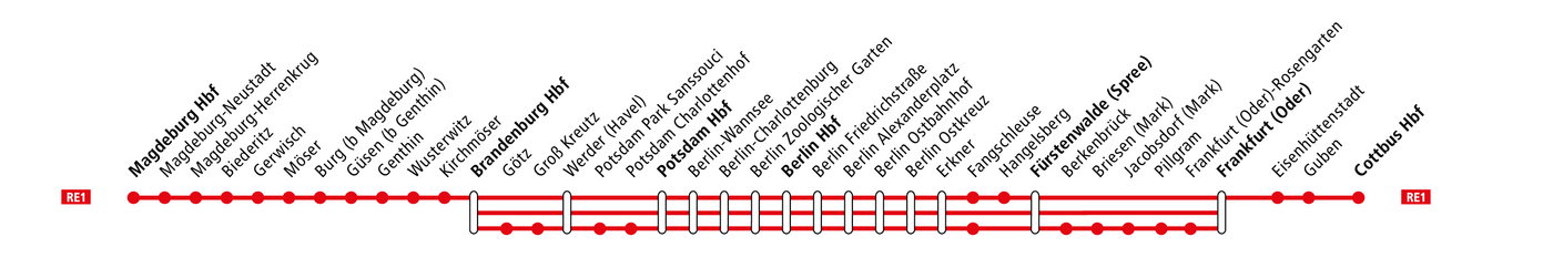 Dreimal in der Stunde verbindet nun der RE1 in der Hauptverkehrszeit Brandenburg a. d. Havel und Frankfurt (Oder) mit der Hauptstadtmetropole Berlin. Einmal in der Stunde fährt einer der drei Züge als Expresszug mit weniger Halten, ist dafür aber schneller am Ziel. Sachsen-Anhalts Hauptstadt Magdeburg und die Stadt Cottbus sind weiterhin stündlich angebunden. Klicken Sie hierfür den gesamten Fahrplan.